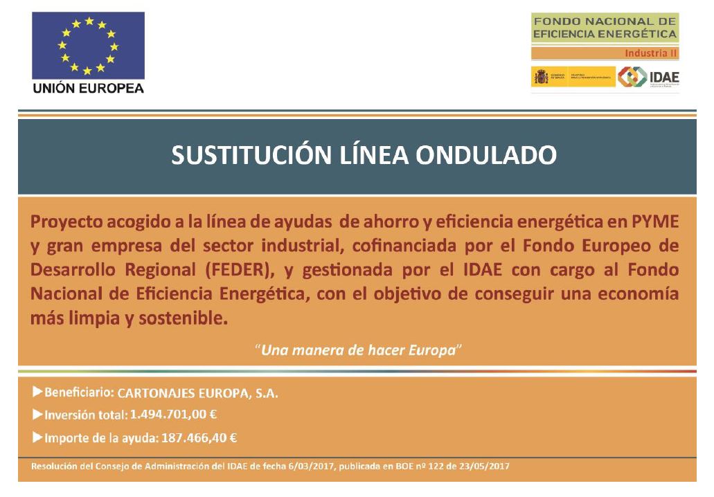 CARTONAJES EUROPA, S.A., ha recibido una ayuda para su proyecto de ahorro y eficiencia energética SUSTITUCIÓN LÍNEA ONDULADO, a través del FONDO NACIONAL DE EFICIENCIA ENERGÉTICA y gestionado por el INSTITUTO DE DIVERSIFICACIÓN Y AHORRO DE LA ENERGÍA (IDAE), ayuda cofinanciada por la Unión Europea a través del Programa Operativo FEDER de Crecimiento Inteligente 2014-2020. Se ha elaborado un proyecto de ahorro y eficiencia energética consistente en la sustitución de la línea de Ondulado en la fabricación del cartón ondulado, cual incorpora nueva tecnología BHS de calentamiento periférico de los rodillos que incrementa la transferencia de calor al producto minimizando el consumo energético. Se ha requerido la colaboración de los mejores fabricantes de equipamiento del sector, que nos aportarán grandes ahorros energéticos y medioambientales en el proceso, consiguiendo un ahorro estimado de 139,50 tep/año.
