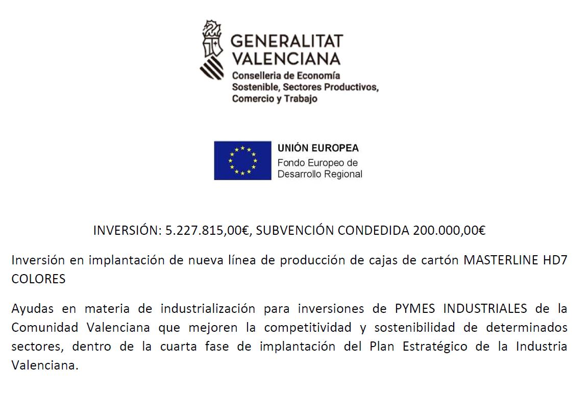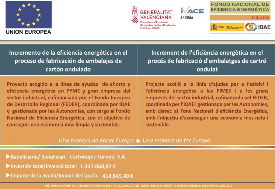 CARTONAJES EUROPA, S.A. ha recibido una ayuda para su proyecto de ahorro y eficiencia energética INCREMENTO DE LA EFICIENCIA ENERGÉTICA EN EL PROCESO DE FABRICACION DE EMBALAJES DE CARTÓN ONDULADO proyecto acogido a las ayudas de I.D.A.E. e IVACE cofinanciado por la Unión Europea dentro del Programa Operativo FEDER 2014-2020 con Fondo Europeo de Desarrollo Regional (FEDER), coordinada por IDAE y gestionada por las autonomías, con cargo al Fondo Nacional de Eficiencia Energética, con el objetivo de conseguir una economía más limpia y sostenible. Se ha elaborado un proyecto de ahorro y eficiencia energética consistente en la sustitución de la actual descarga manual de la onduladora (color amarillo) (proceso muy lento) por un proceso automático que elimine un cuello de botella permitiendo disminuir el consumo específico de energía eléctrica y térmica. Se ha requerido la colaboración de los mejores fabricantes de equipamiento del sector, que nos aportarán grandes ahorros energéticos y medioambientales en el proceso. Gracias al proyecto se ahorran 177,29 teps anuales.